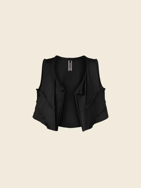 Open gilet in stretch cotton fleeceDiagonal stitching detailPointed front hemShort cut at the waistRaw cut...