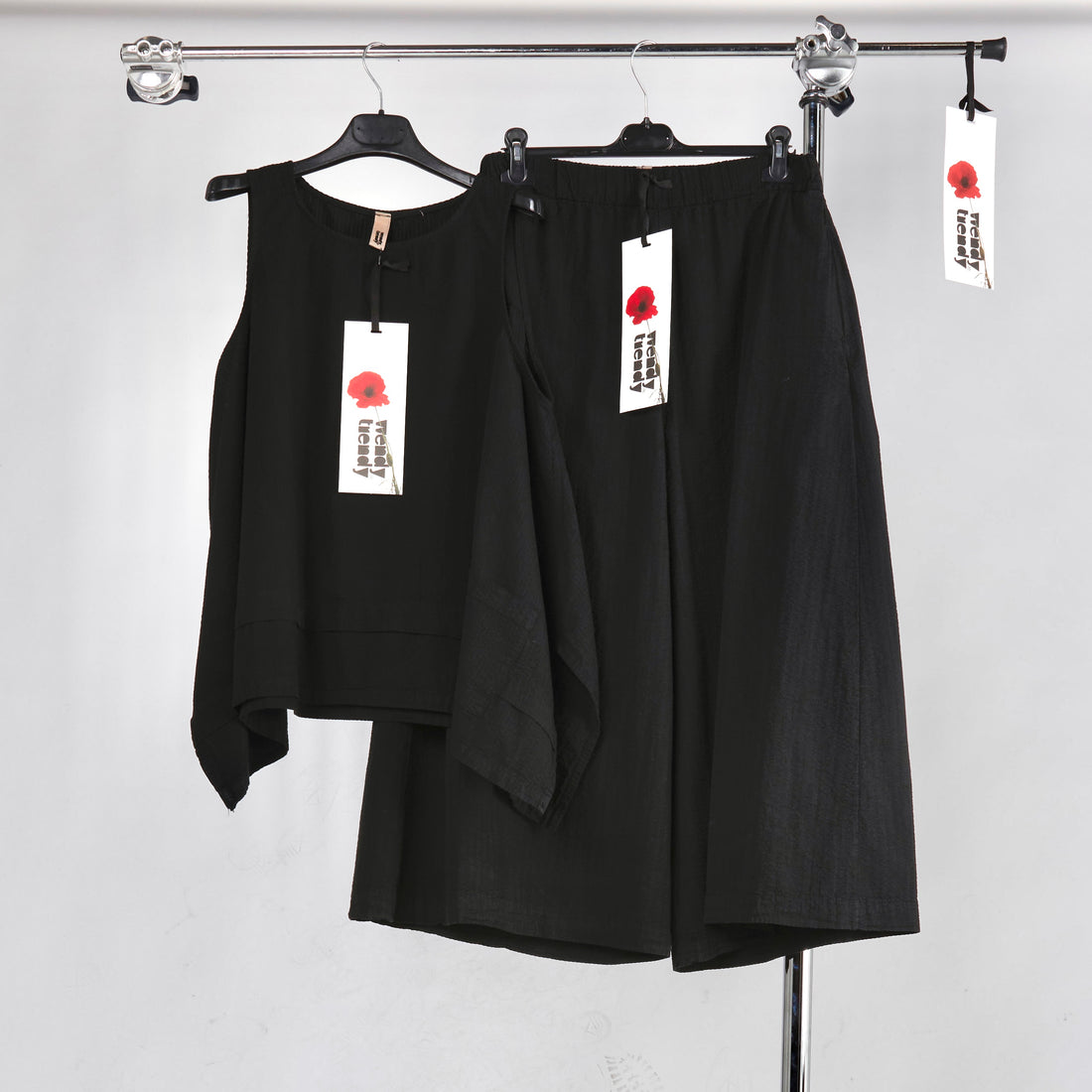 Viscose blend fabricFront seam with inserted pocketsVoluminous bottomWide and flared line