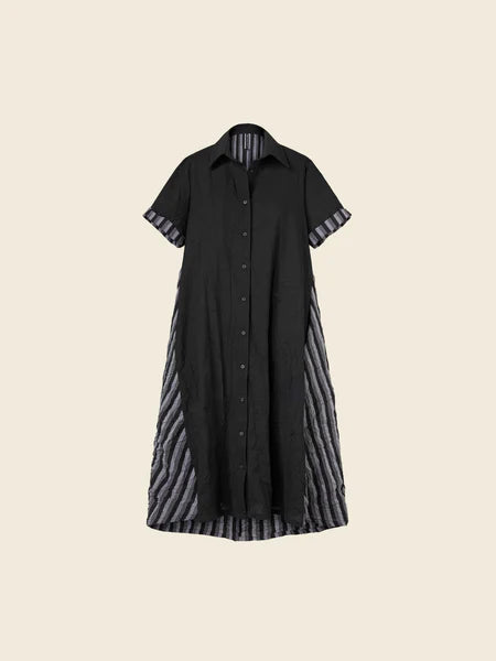 Long Chemisier dressFront in black cotton blend fabricBack in striped cotton blend fabricDoubled short sleevesSide...