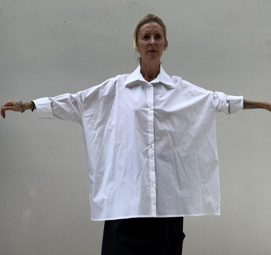 Stretch cotton poplin blouseOval neckline with rufflesLong puff sleeves with cuffsLonger backWide and square cutComfortable...