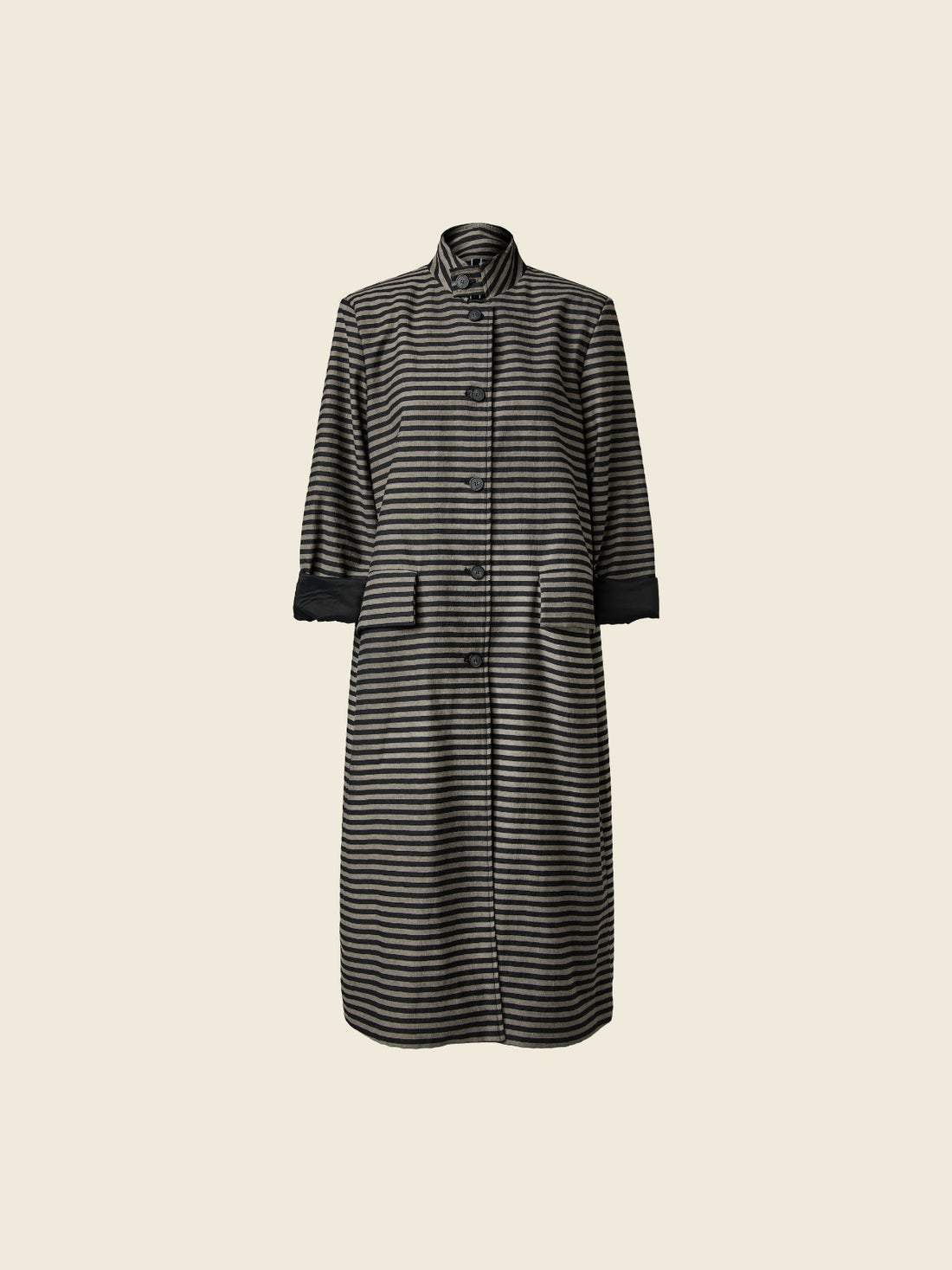 Lined jacket in striped fabric Frontal closure with buttons Mandarin collar Regular shoulder and long...